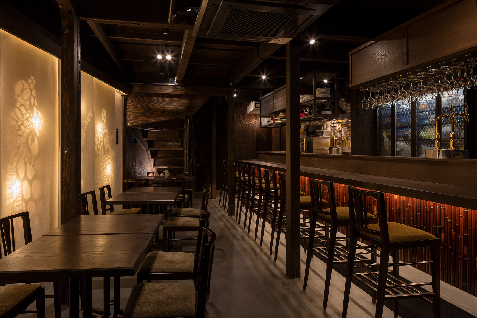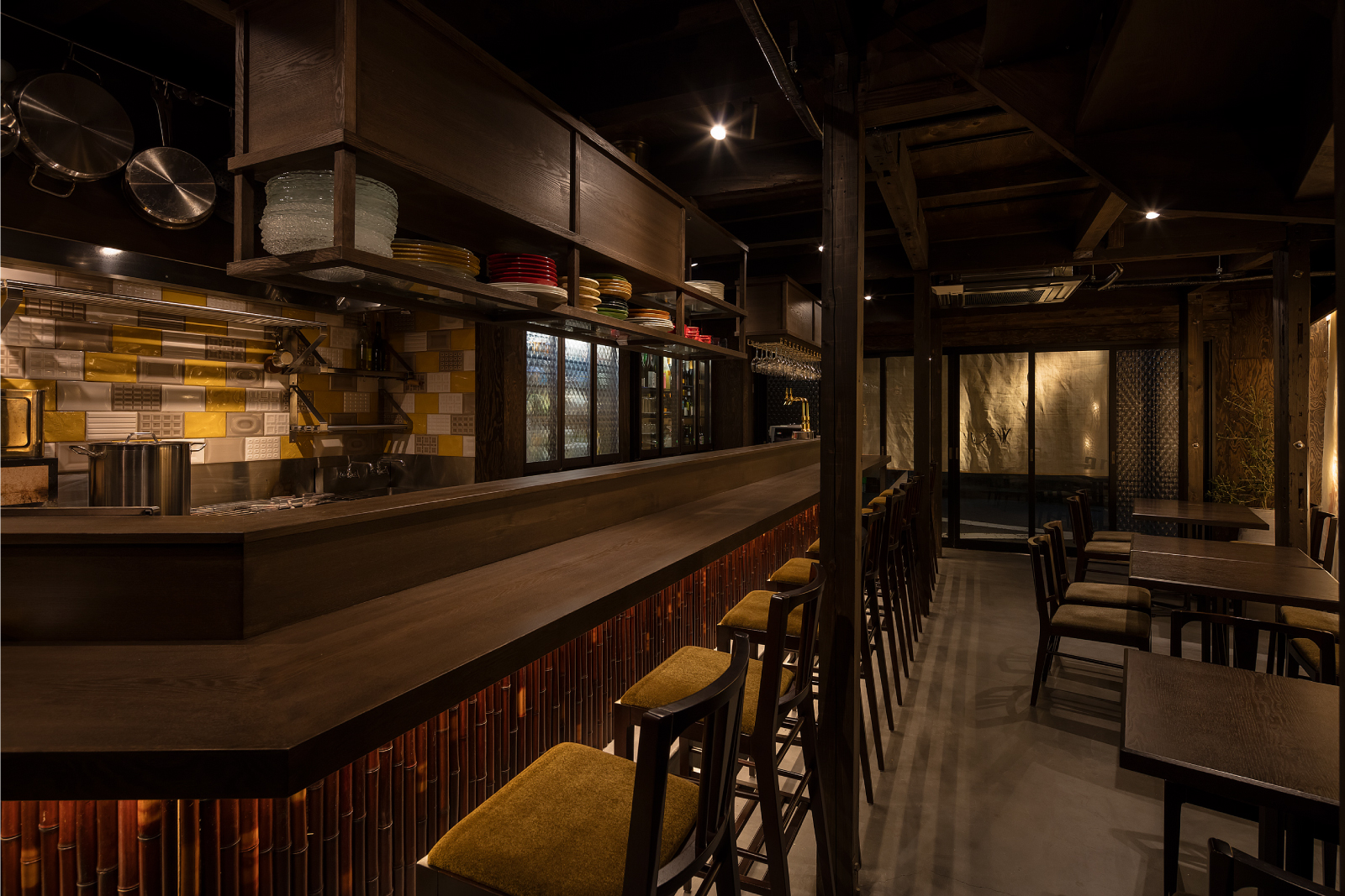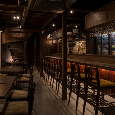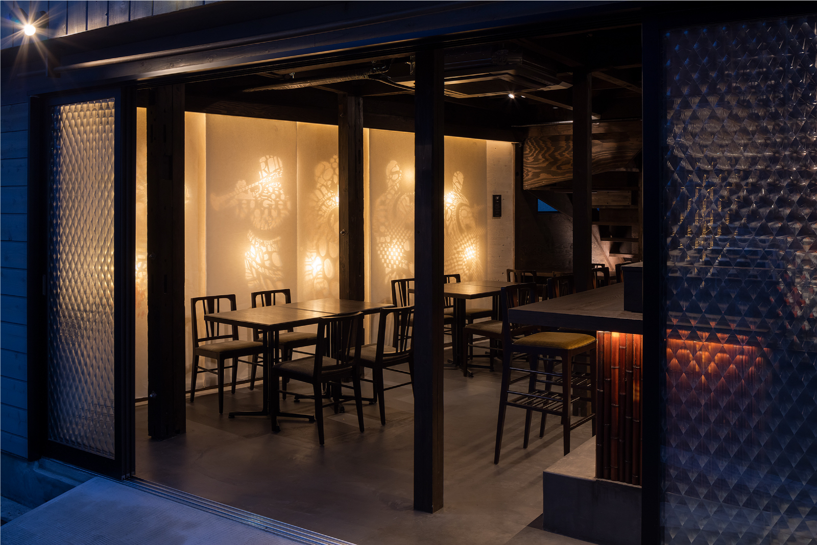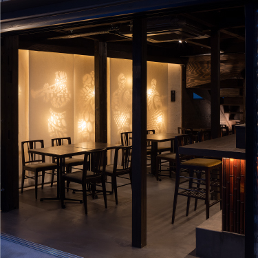 構造体がスケルトン化された状態をそのまま生かし、上から和紙にインクを落とした時に滲み広がるように、飲食の機能を落とし広げていく。