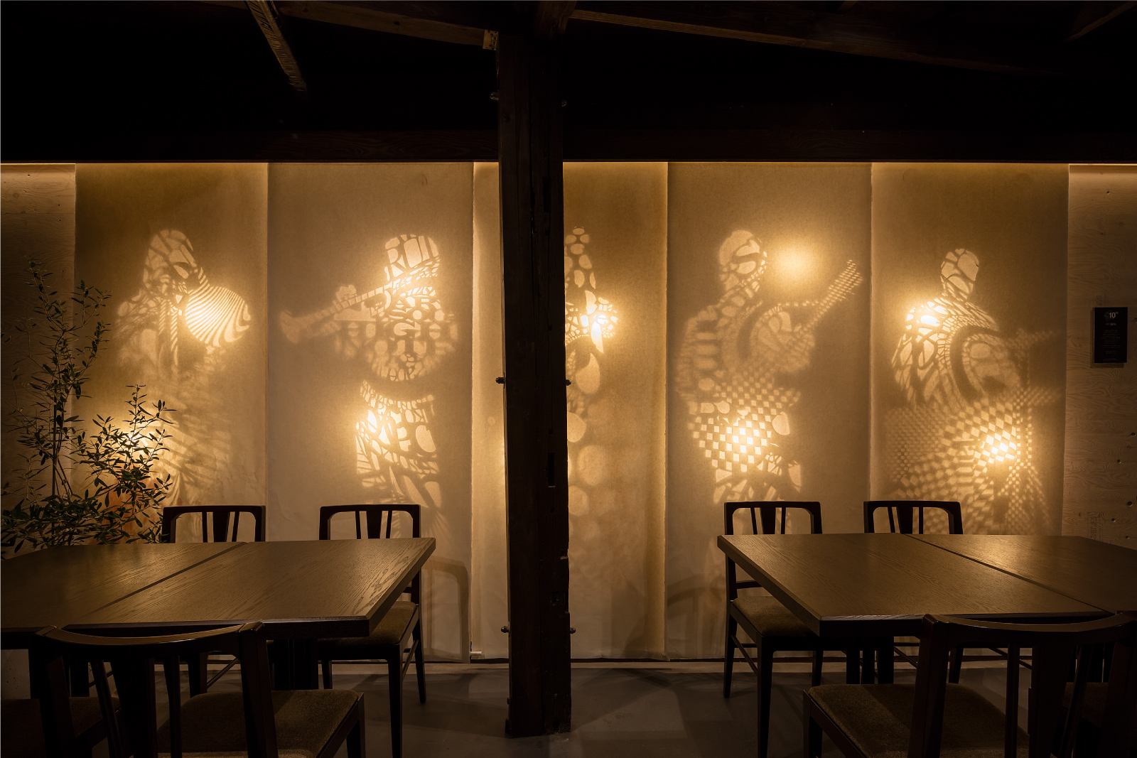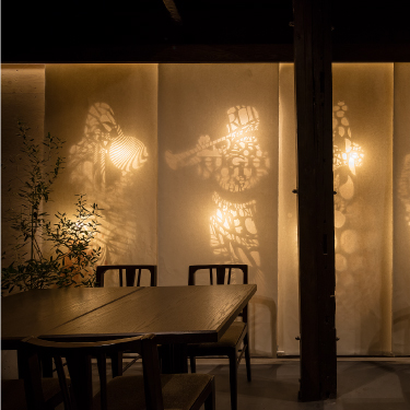 切り絵の光による残像、左官の墨染め、竹の煤染め、ガラスの屈折。