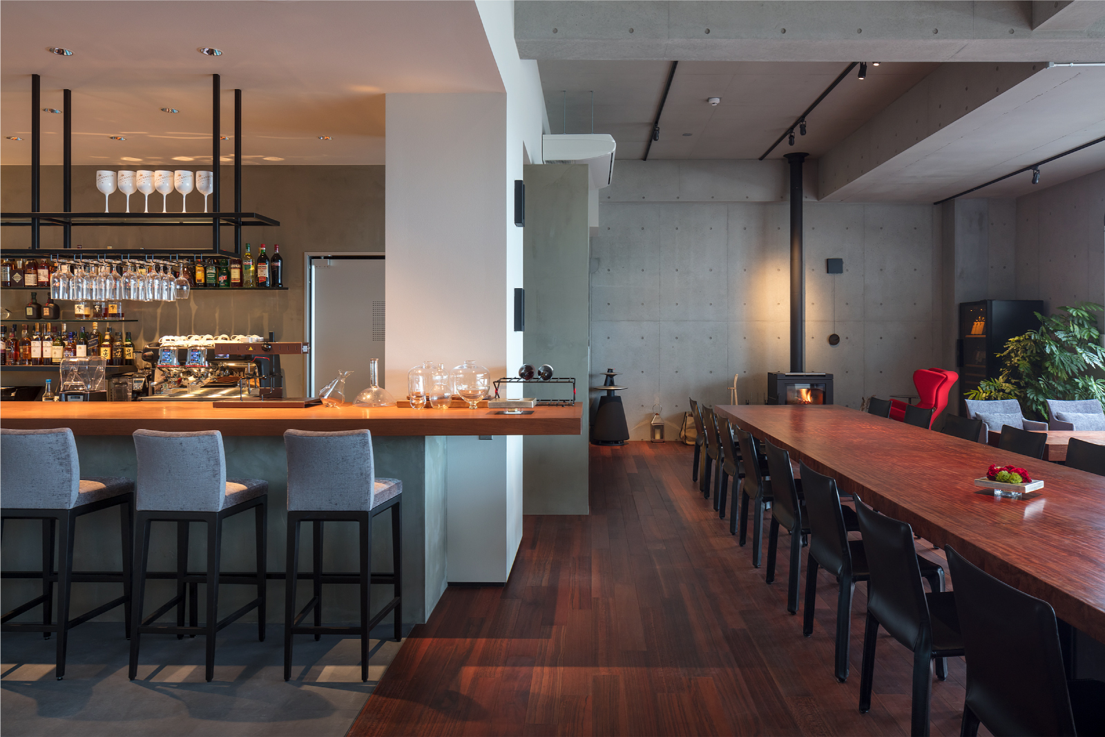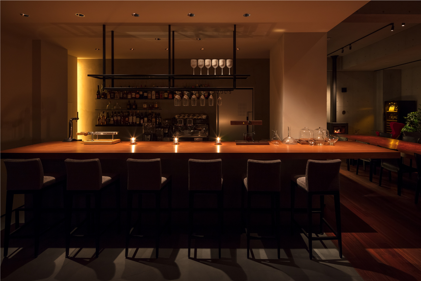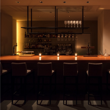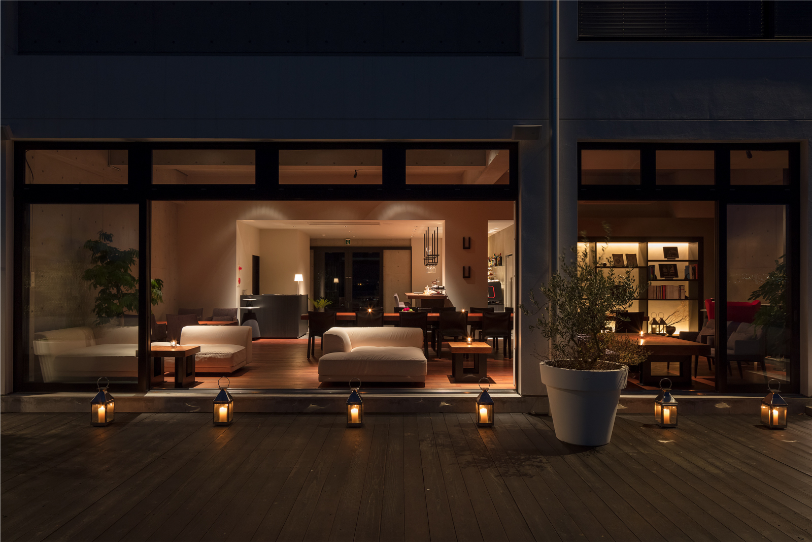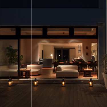夜は赤褐色の木と夜景のコントラストが織り成す 贅沢な空間 へと変貌を遂げる。