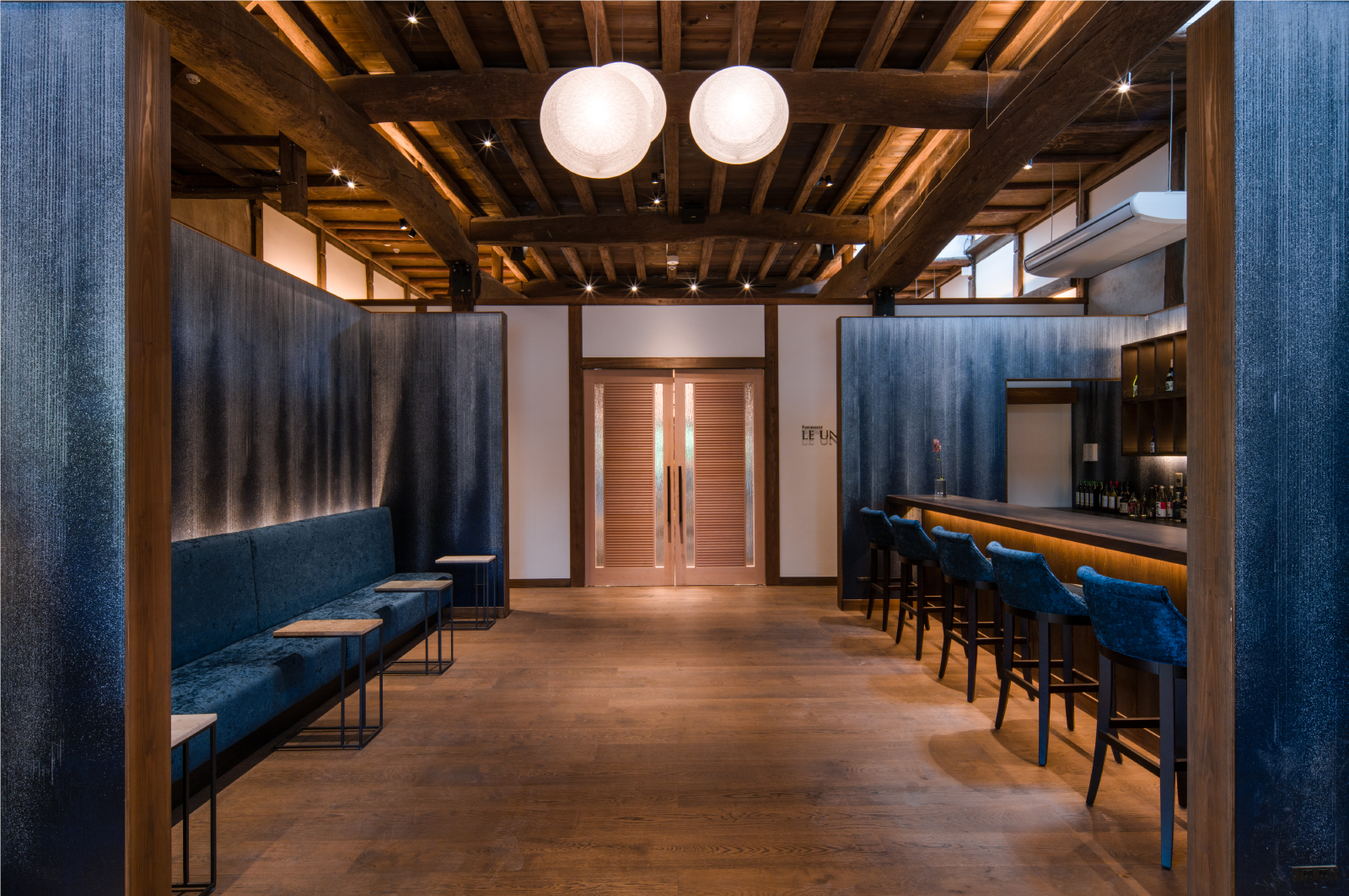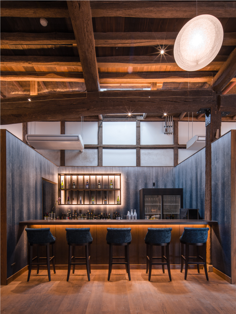 築160年を超える酒蔵は、佐原の町並みや歴史を背景に、「酒蔵の表情」と「水の表情」をキーワードとして、柱や梁、壁天井は蔵の原型を崩さずなるべくそのままの表情として復元し、光によるガラスの屈折や水流をイメージした和紙をエレメントして取り込んでいます。