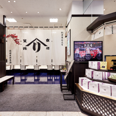 店頭には物販が立ち並び、暖簾を潜ると茶寮席が広がる、二つのエリアをしっかり隔てた空間構成としています。
