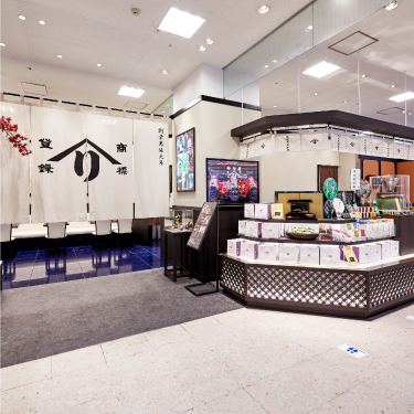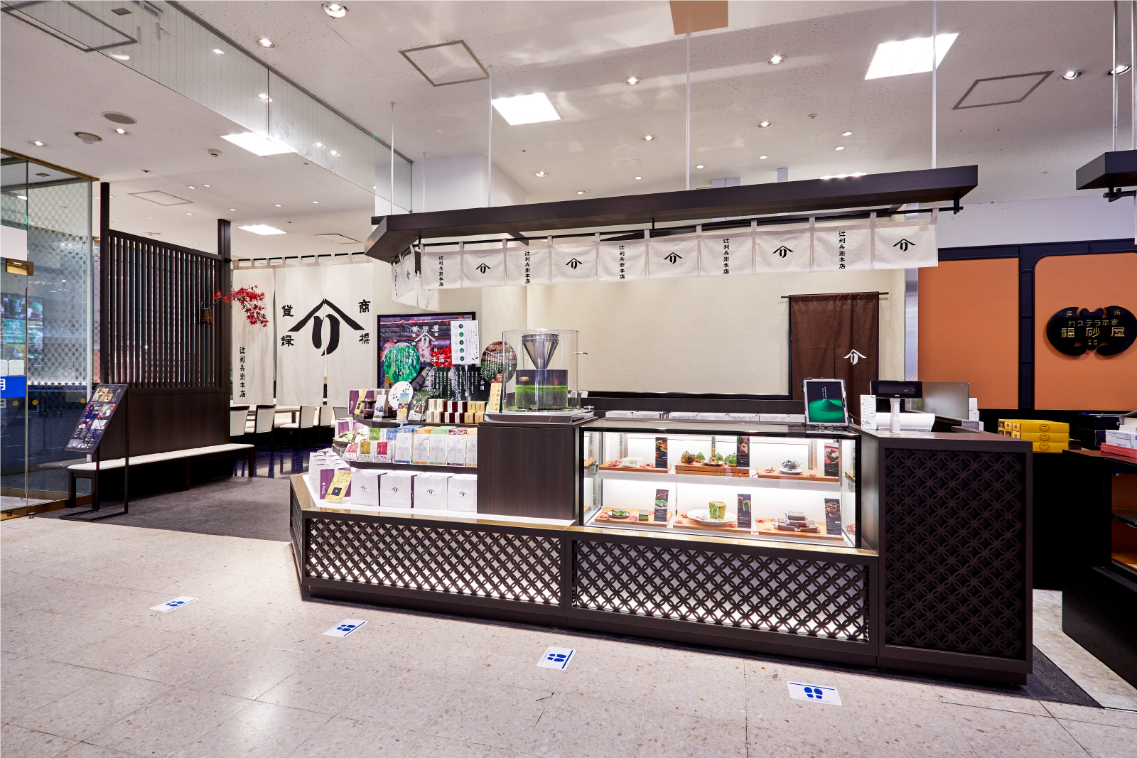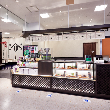 施設のメイン入り口すぐの立地は、店頭に色とりどりの商品が並び、ガラスケースは重厚感と高級感を。石臼機械は実際に抹茶を挽き、しずる感を。