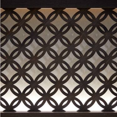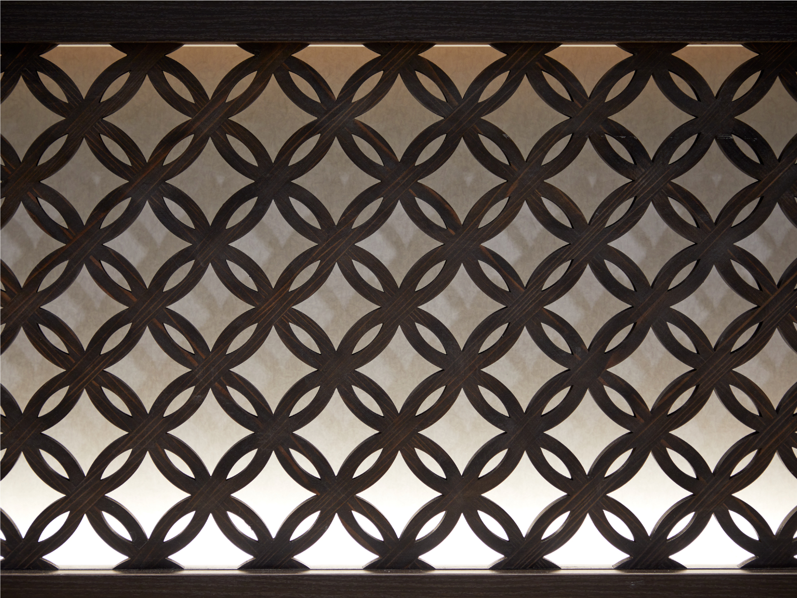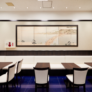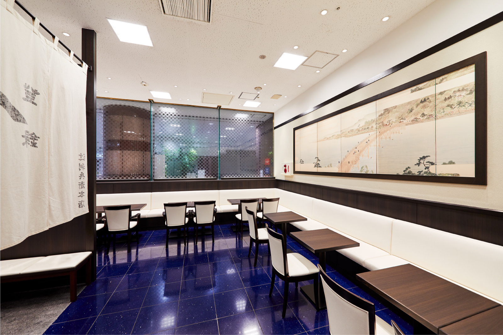 暖簾を潜った先は、床一面が深い青のタイルが広がります。それは、宇治川清流の水をイメージし、壁面の宇治橋の屏風絵により、宇治の情景とこの場所を結ぶ架け橋となります。
