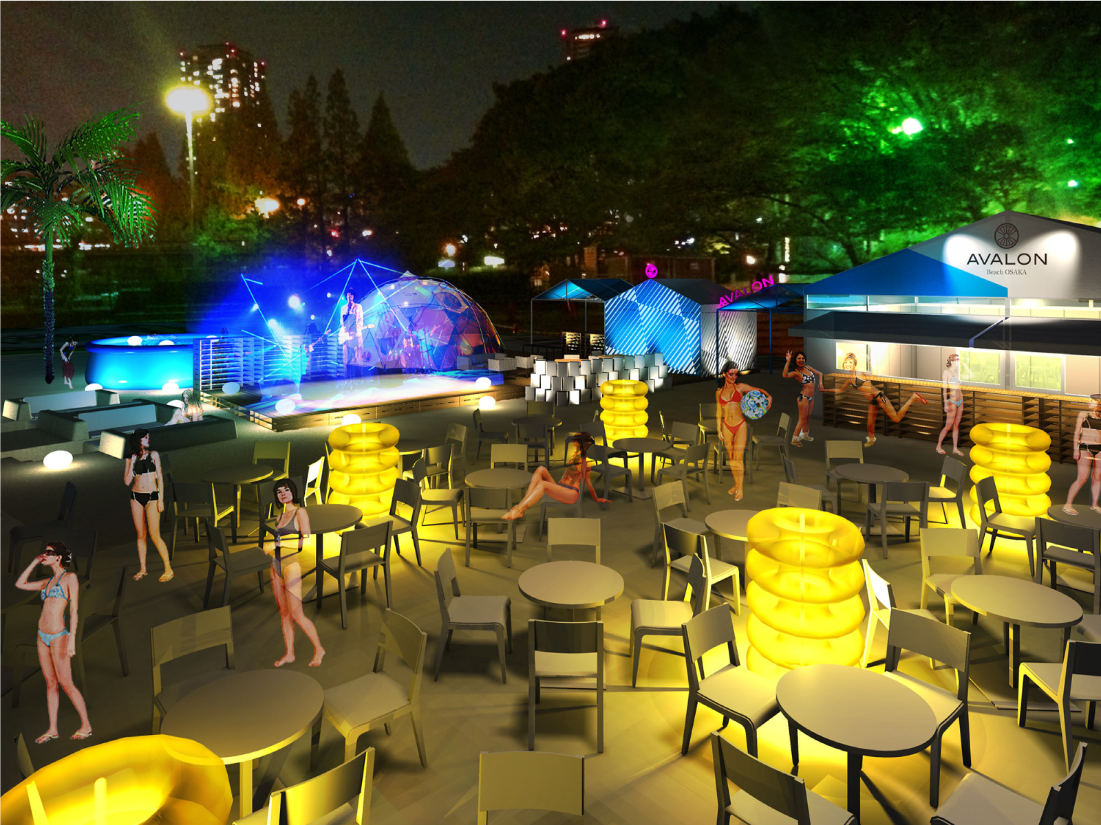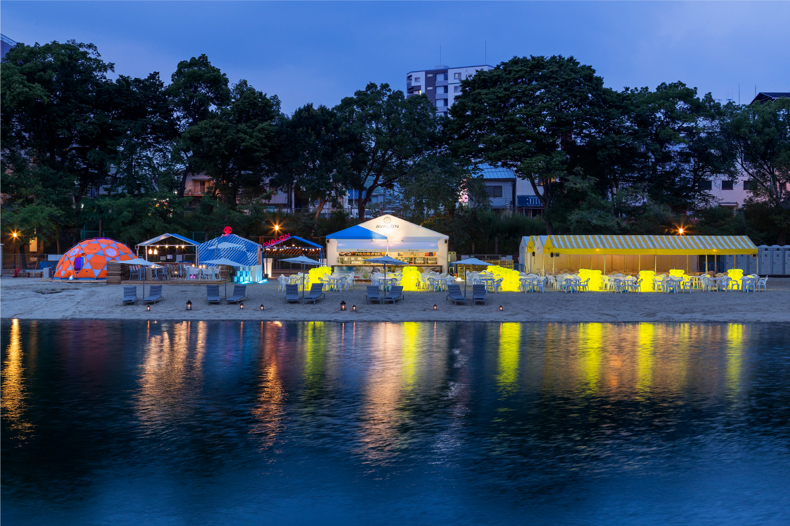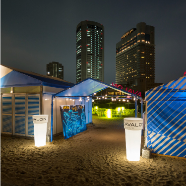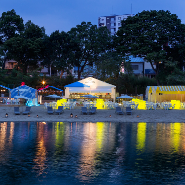 帝国ホテル前対岸、大川沿いにある人工ビーチを、賑わい創出の為の社会的実験として期間限定でオープン。