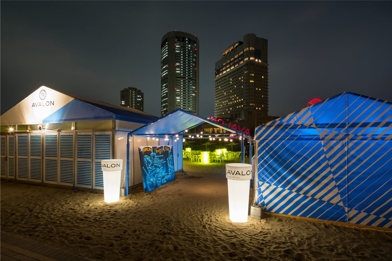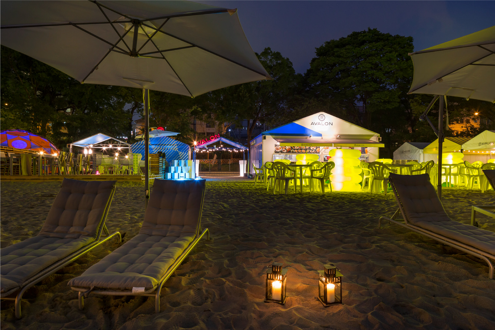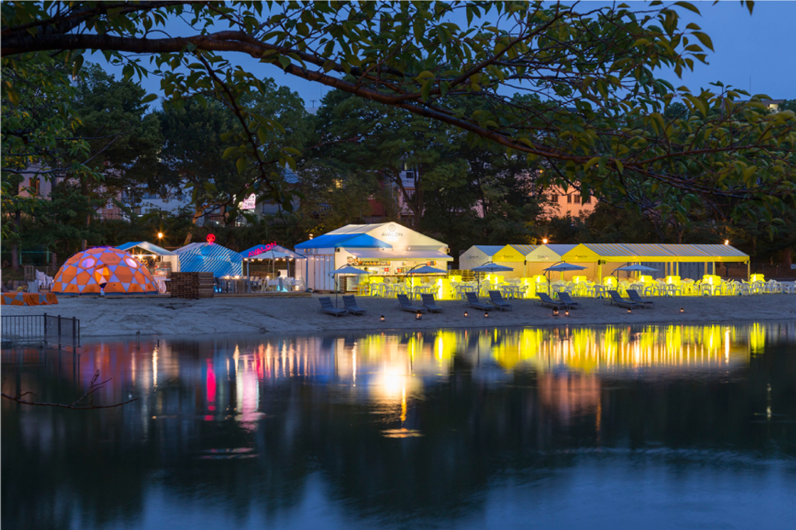 帝国ホテル前対岸、大川沿いにある人工ビーチを、賑わい創出の為の社会的実験として期間限定でオープン。