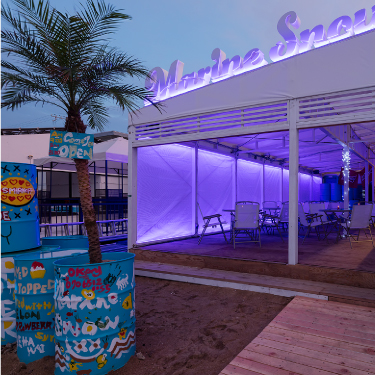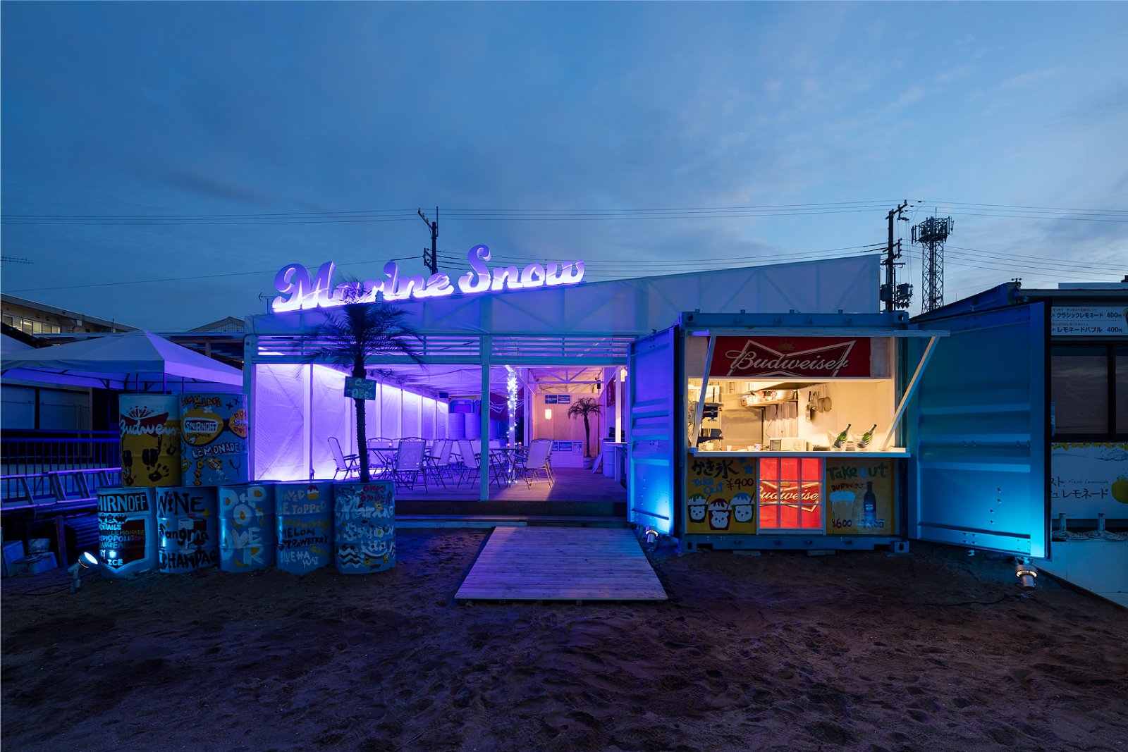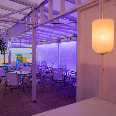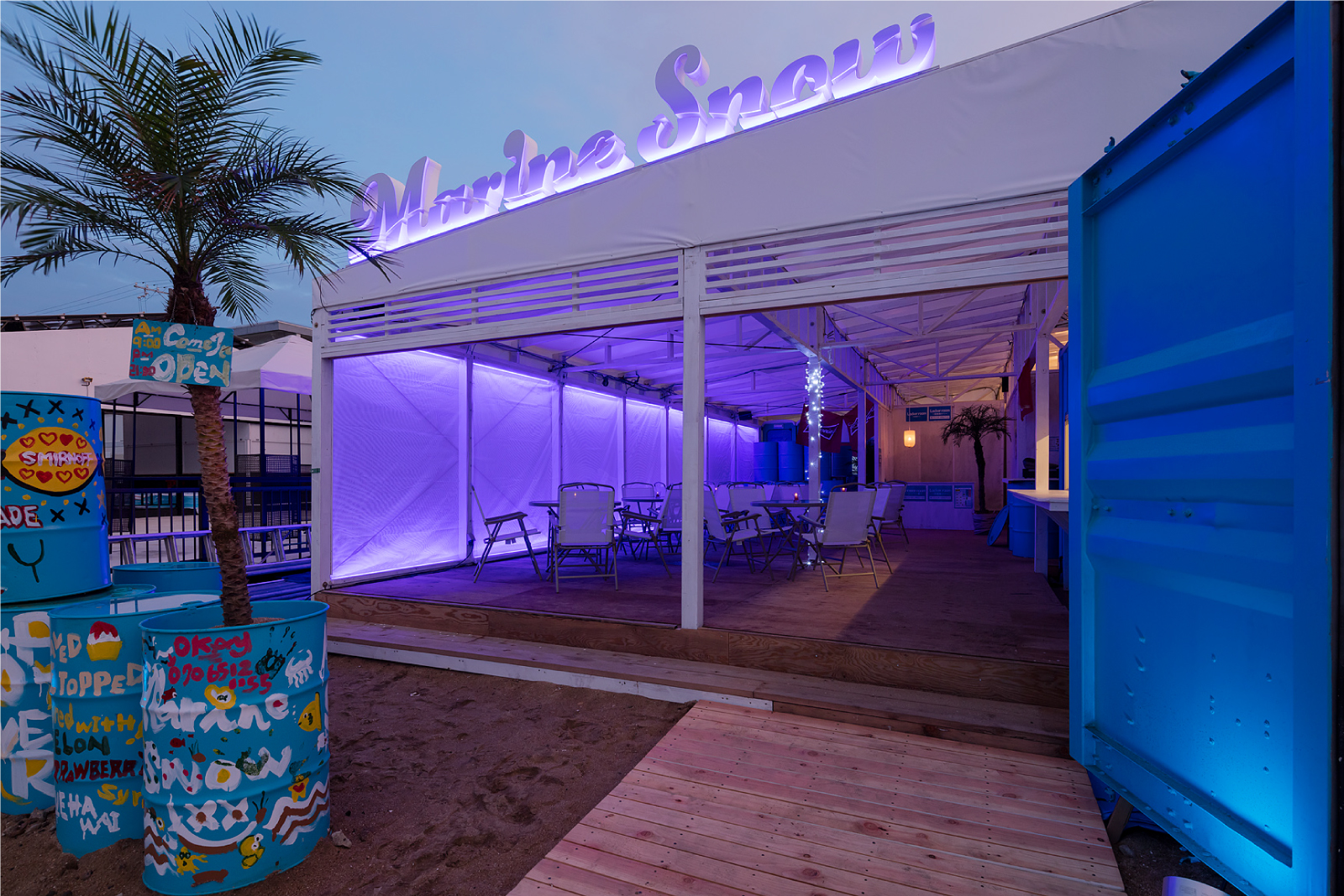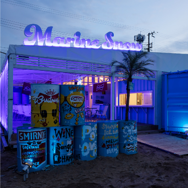 昼は海に開けた空間として、夜はマリンブルーの光壁に、白のLED点光源を重ねることで、地上に現れる深海が、外部とは隔離した独特の世界観をつくりだす。。