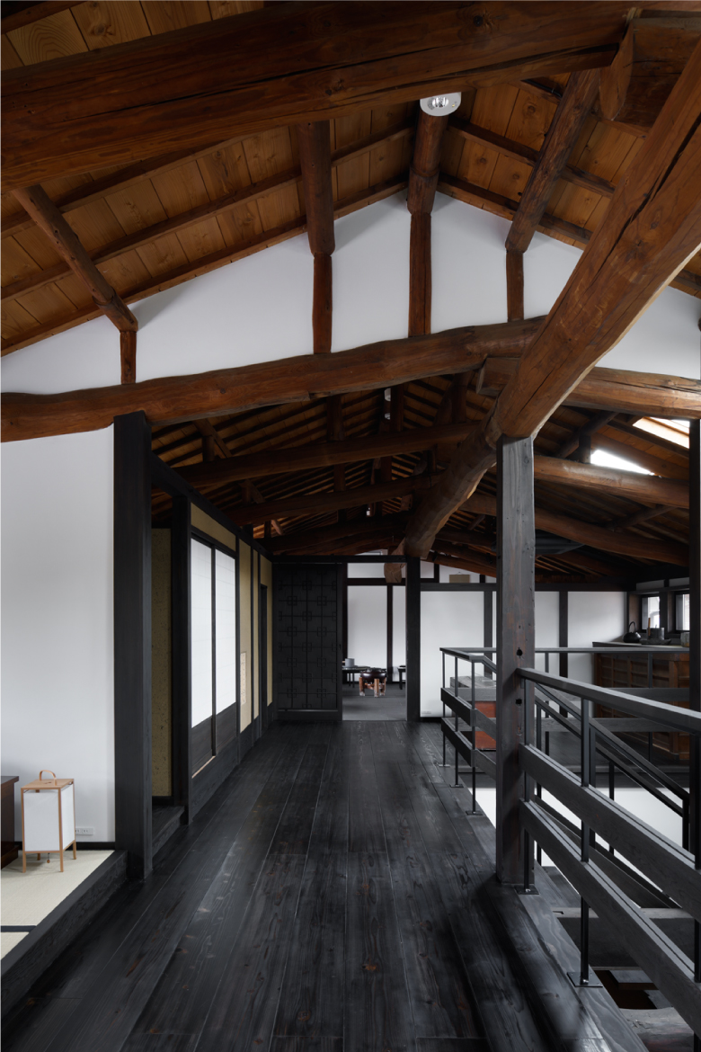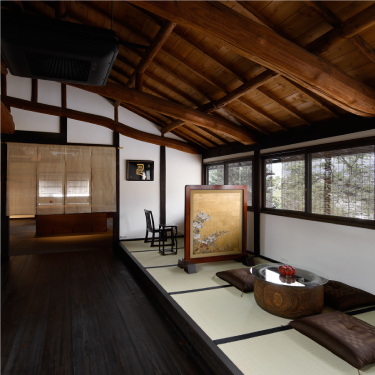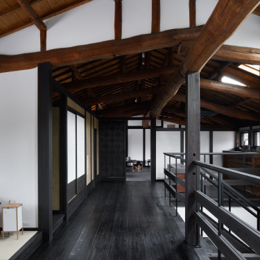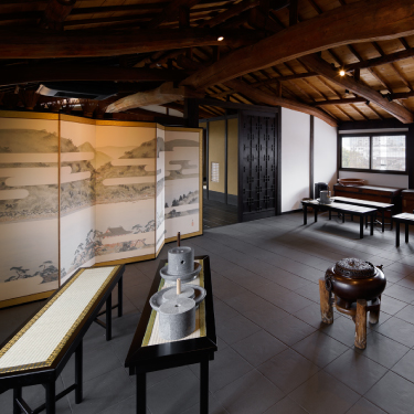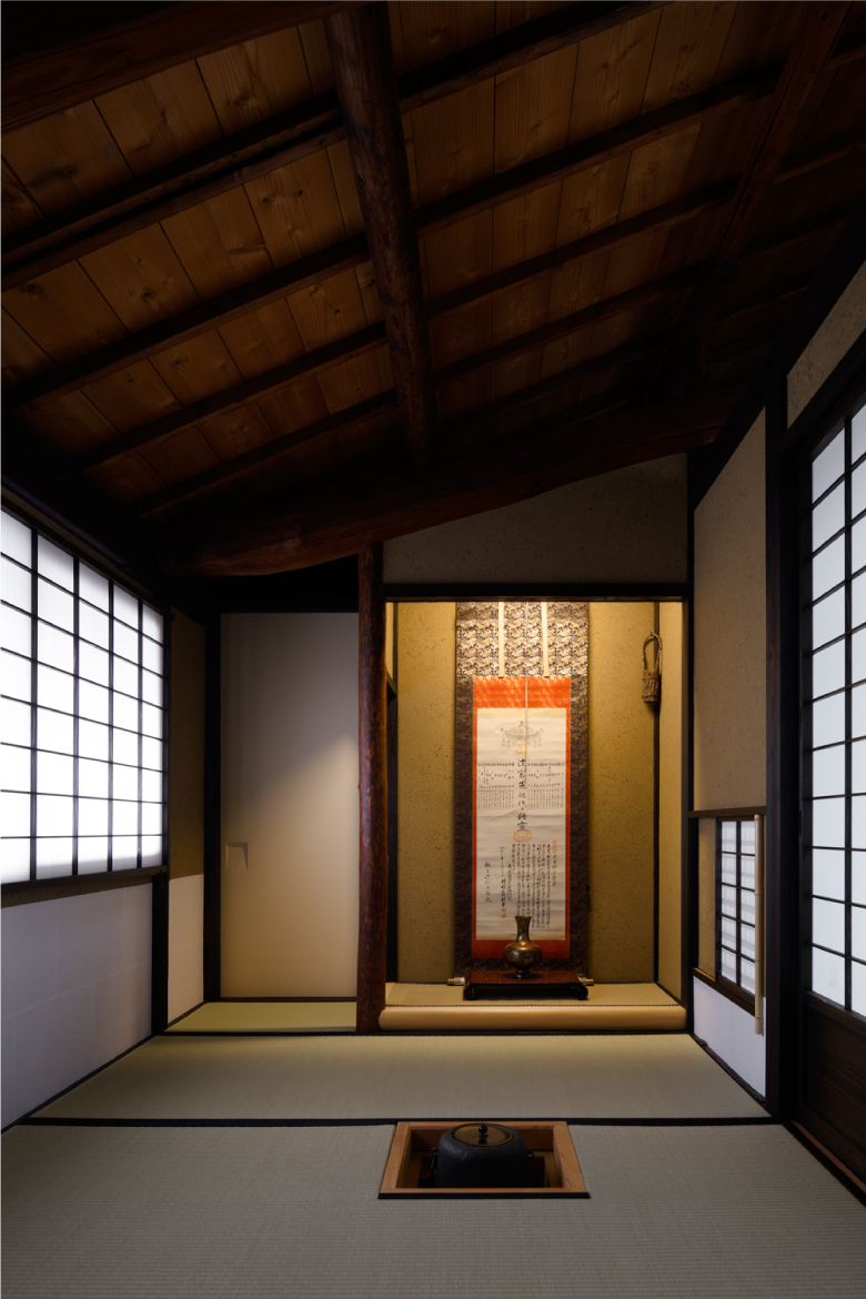 本店茶寮 1F、坪庭階段から2階へ。百年以上経つ柱、梁、天井はそのままに、蔵を改装した「花見畳席」「茶室」「挽き茶体験教室」「アトリエ」からなる。