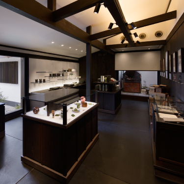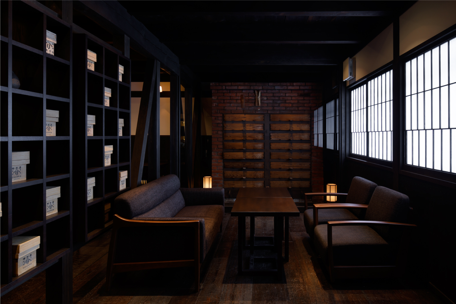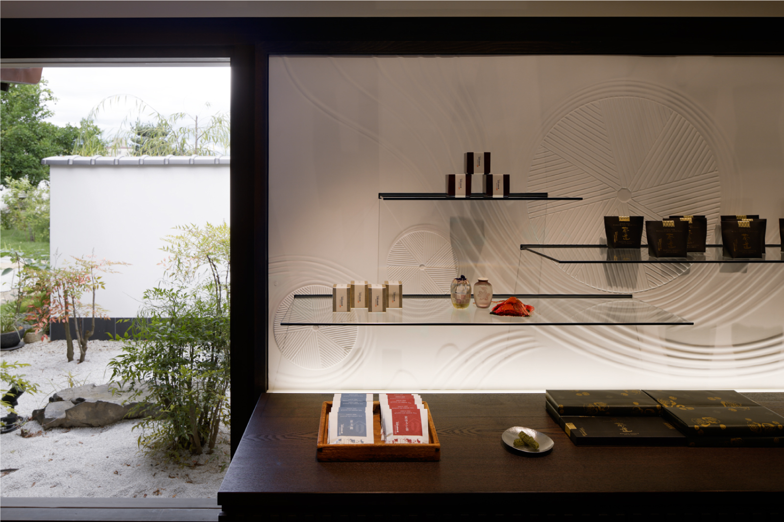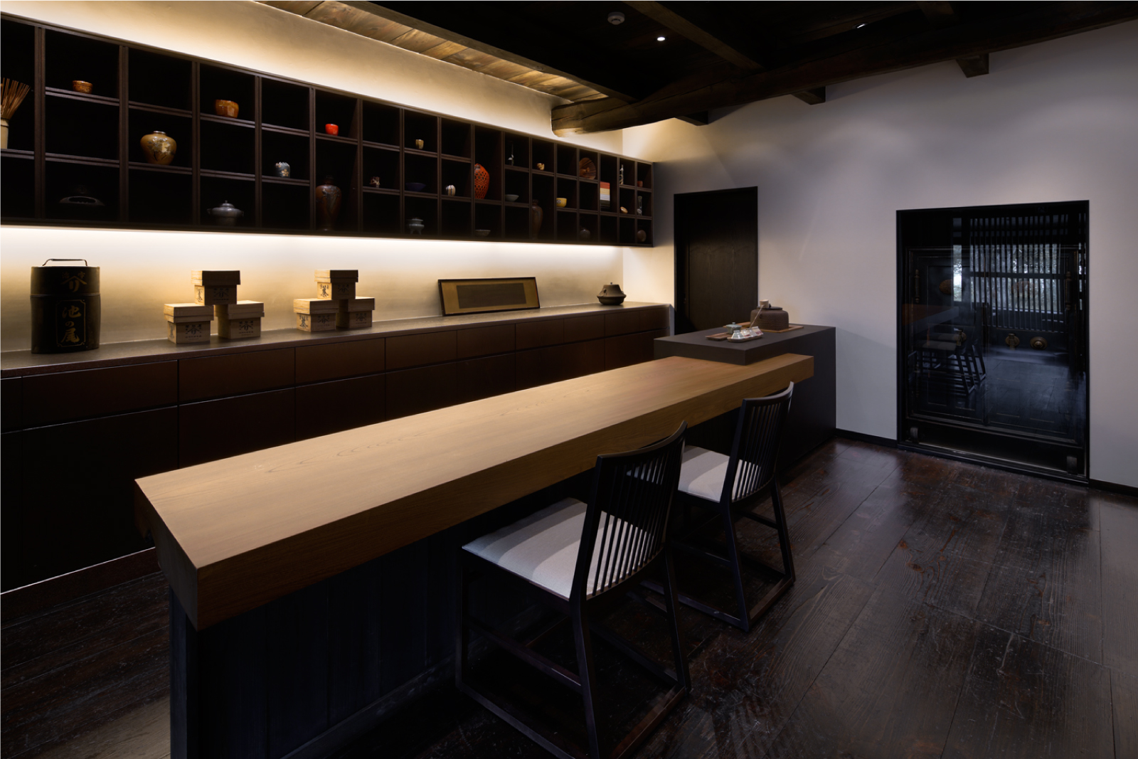 人の気配を感じとり、中庭の光を十分に取りいれた、幾重にも重なる格子が光と影を生み出し、時間の経過を認識させる。空間全体が一枚の切り絵のように装飾され、また、茶櫃をルーツにした装飾が、お茶の香りと共に包み込まれていく。その先の歴史をも垣間見せるように。