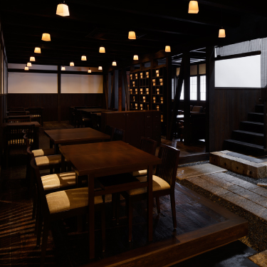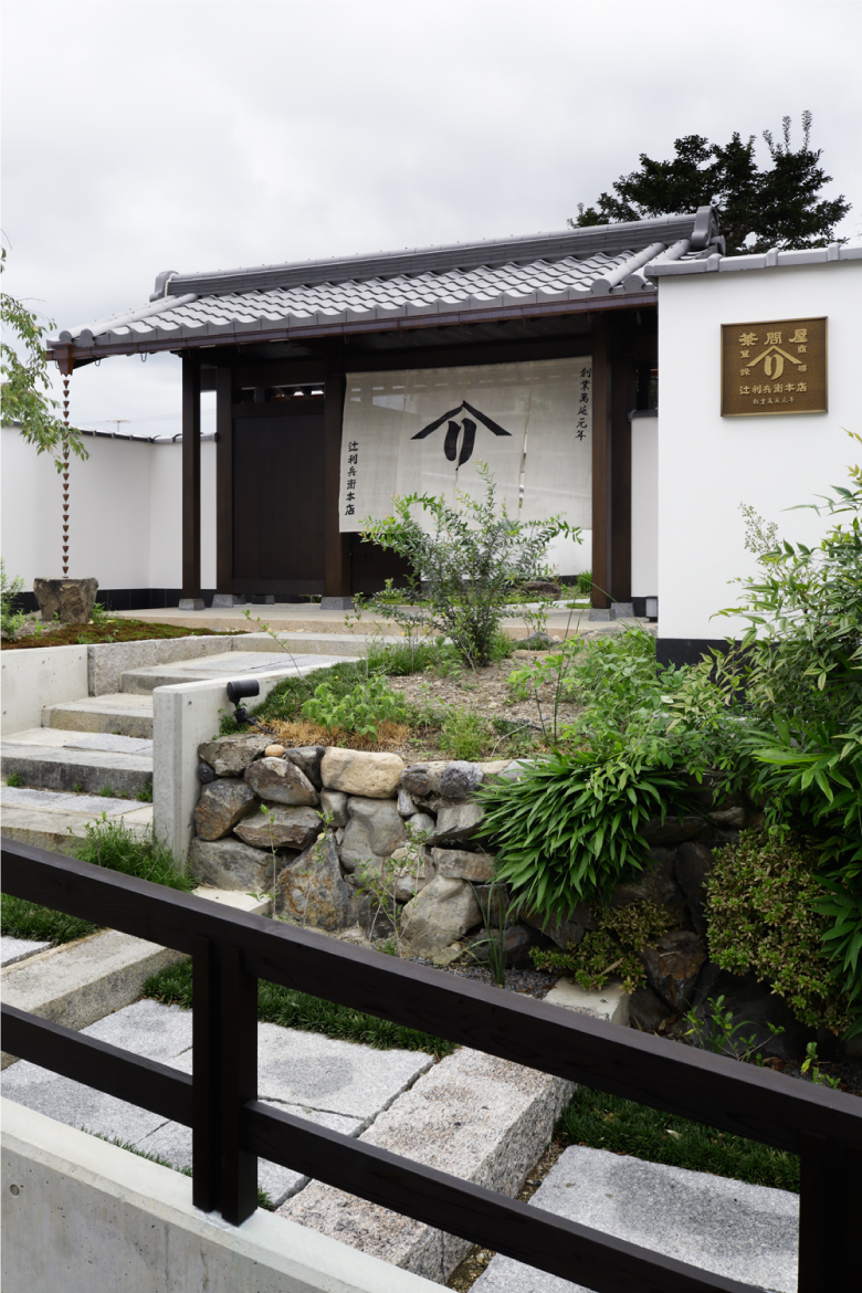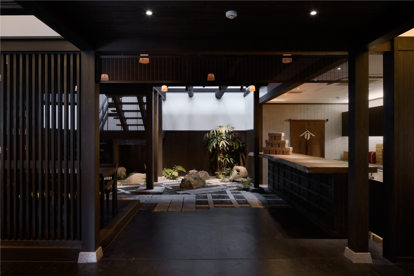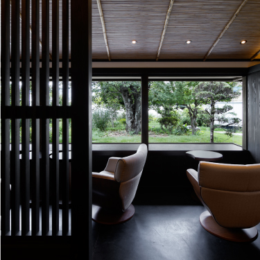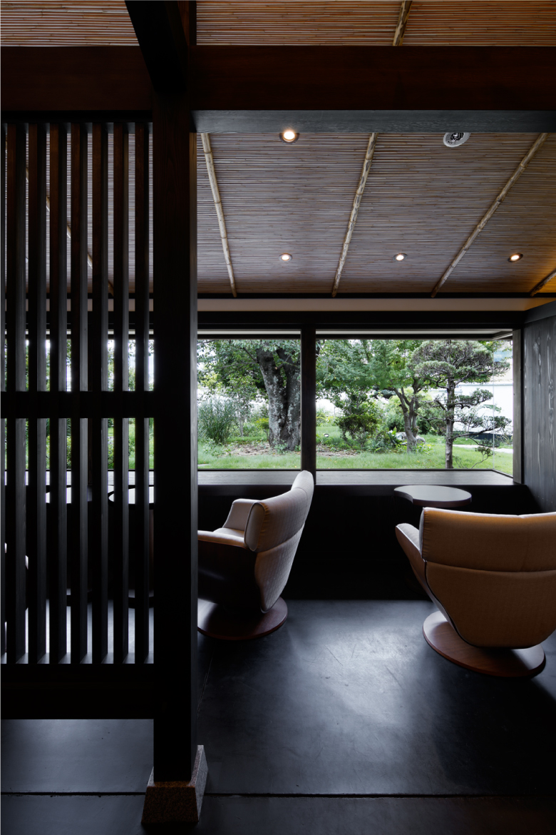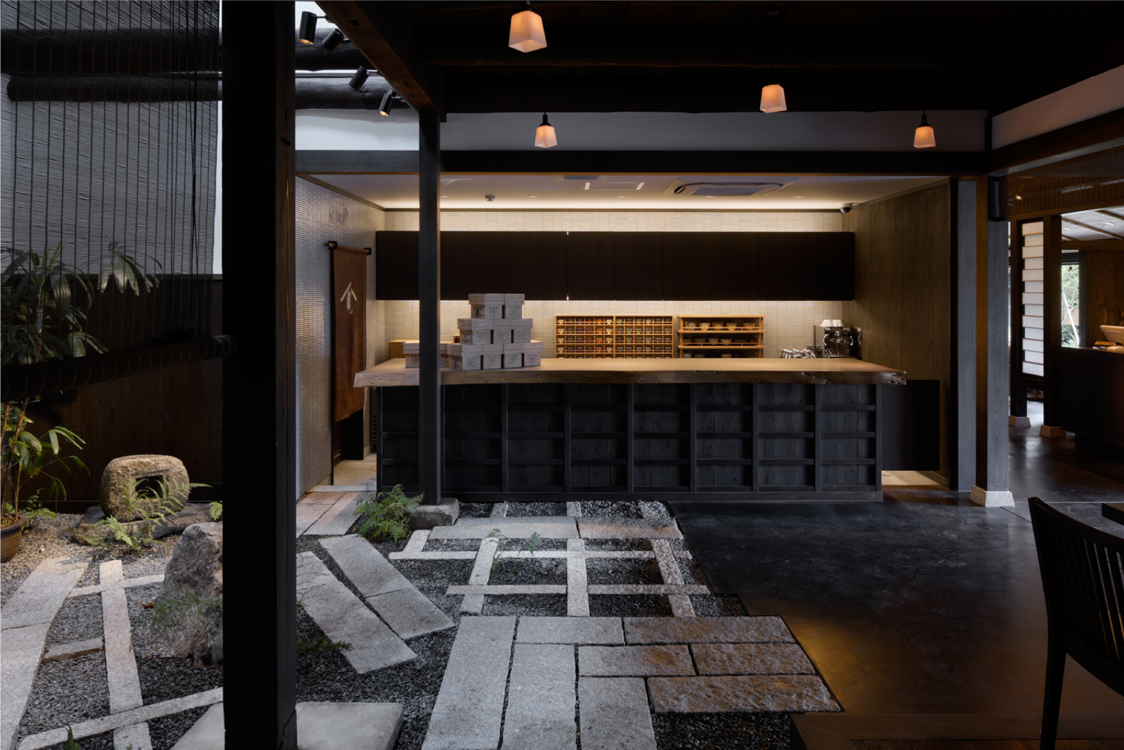 人の気配を感じとり、中庭の光を十分に取りいれた、幾重にも重なる格子が光と影を生み出し、時間の経過を認識させる。空間全体が一枚の切り絵のように装飾され、また、茶櫃をルーツにした装飾が、お茶の香りと共に包み込まれていく。その先の歴史をも垣間見せるように。