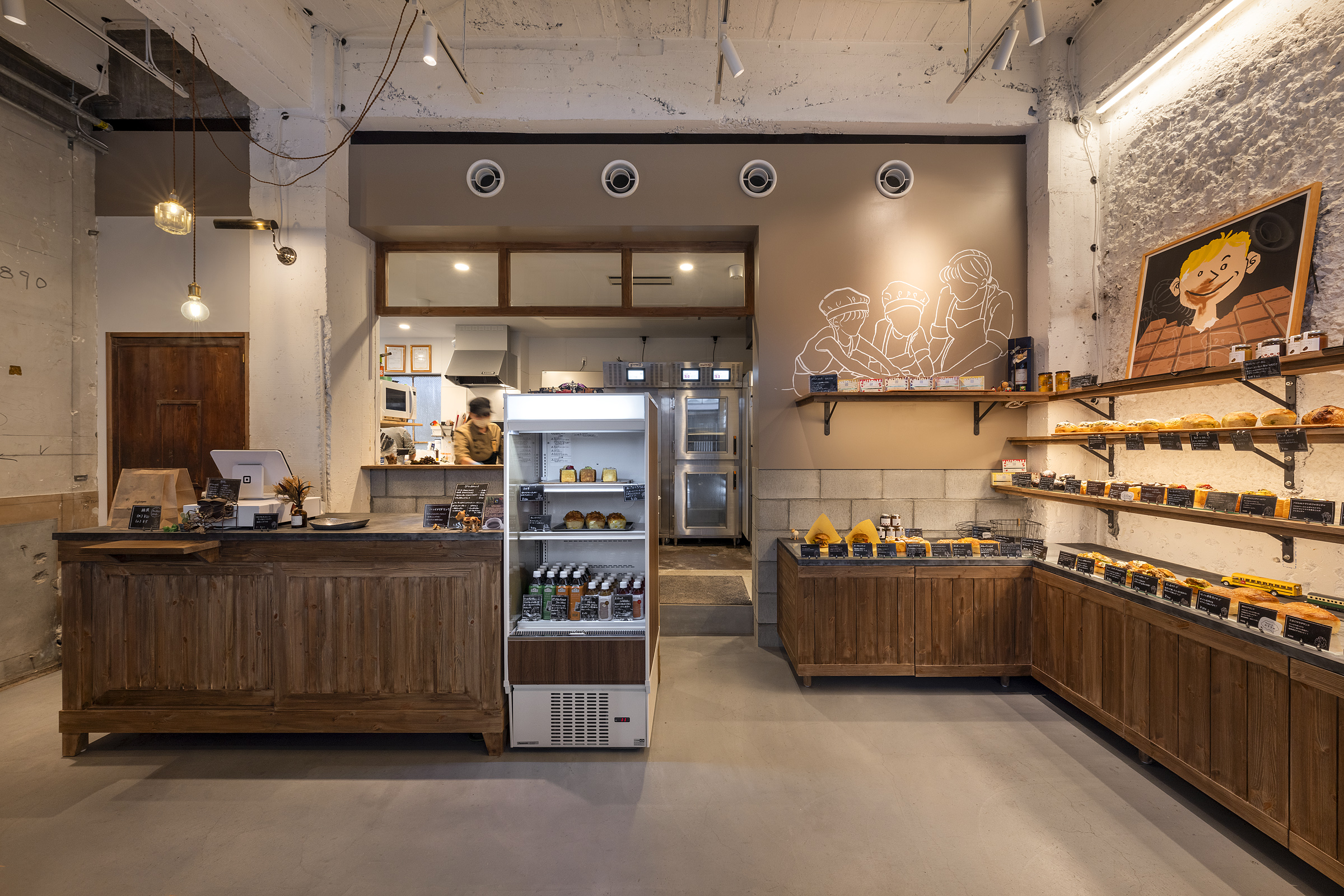 タッチの柔らかな線画に、小麦粉をイメージしたモコモコザラザラの壁、剥き出しの配管、アンティークな和風の家具や建具が、優しい表情となり、暖かみとなり、また新たな家族の風景をつくる。みんなが集える新しくもどこか懐かしい、そんな我が家が出来ました。